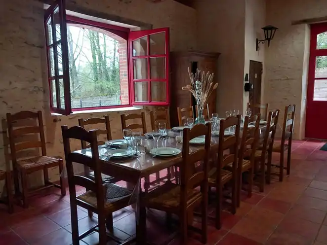 Le gîte de groupe La Minoterie offre une pièce principale de 90 m² alliant charme historique et confort moderne, idéale pour partager des moments conviviaux et profiter pleinement de votre séjour en Vendée.